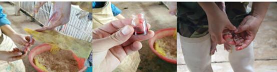 2、当仔猪出生时,将每头母猪分娩的所有仔猪的“脐带血”都挤到一个干净的青霉素瓶中,每头仔猪2-3滴即可。注意必须要采集同窝母猪产的所有的仔猪,避免同窝母猪所产仔猪的个体差异造成漏检。可以双人操作,也可以单独操作,若仔猪脐带血不便挤出,可以将脐带剪成几段再操作即可,具体见下图。