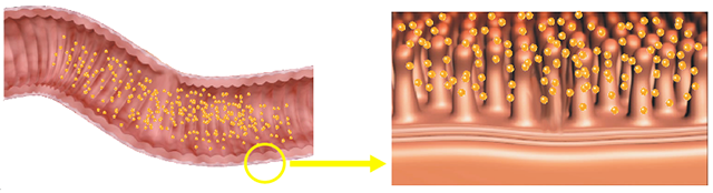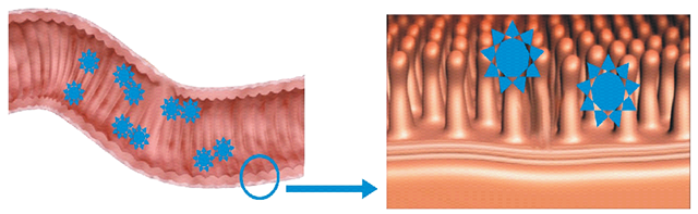 图2:超级抗敌素纳米粒子在肠道中广泛、均匀扩散,微 粒深入地分布于肠绒毛周围,抗菌能力提升5倍。